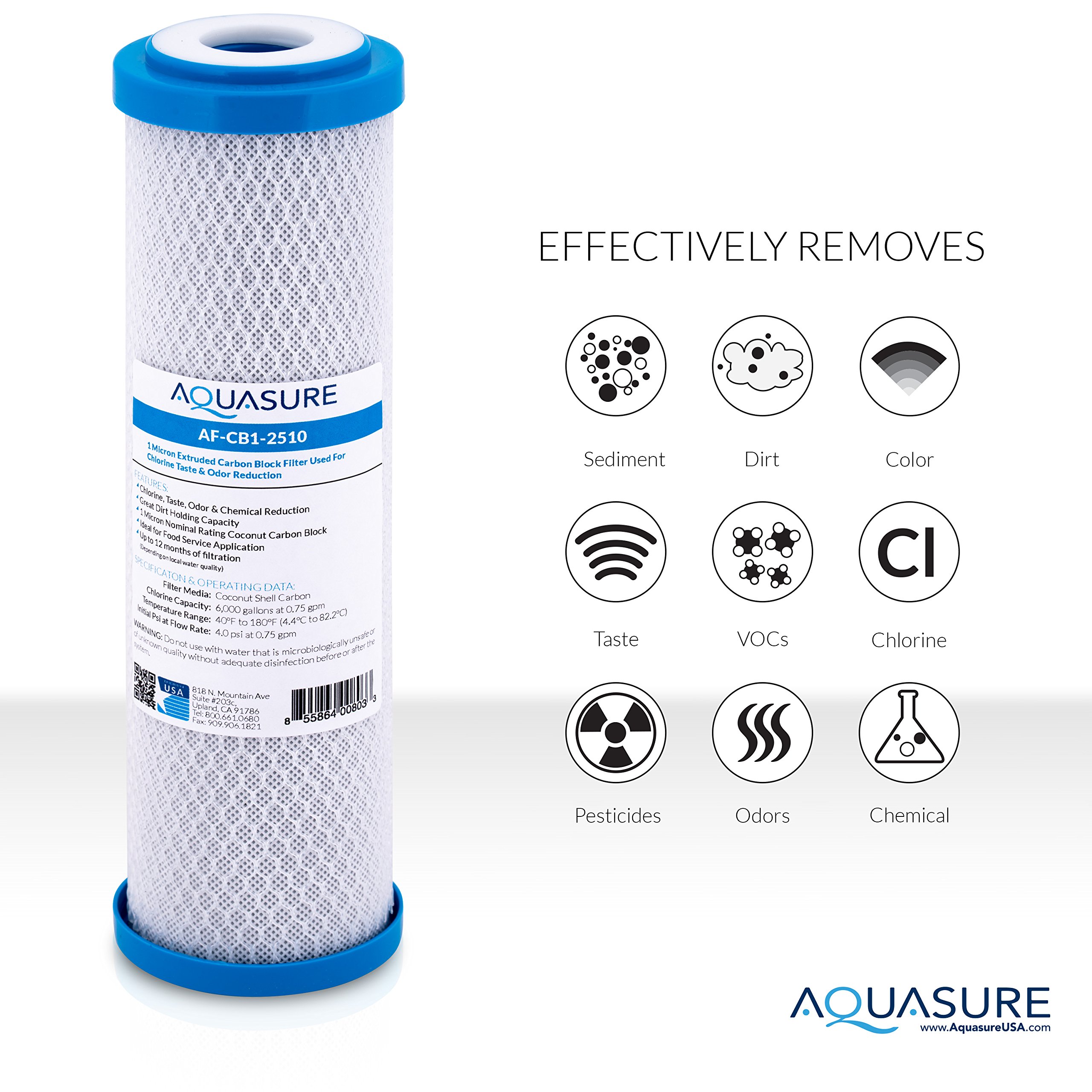 Aquasure Pioneer Series 1 Micron Solid Coconut Shell Carbon Block Water Filter - 10" x 2.5"