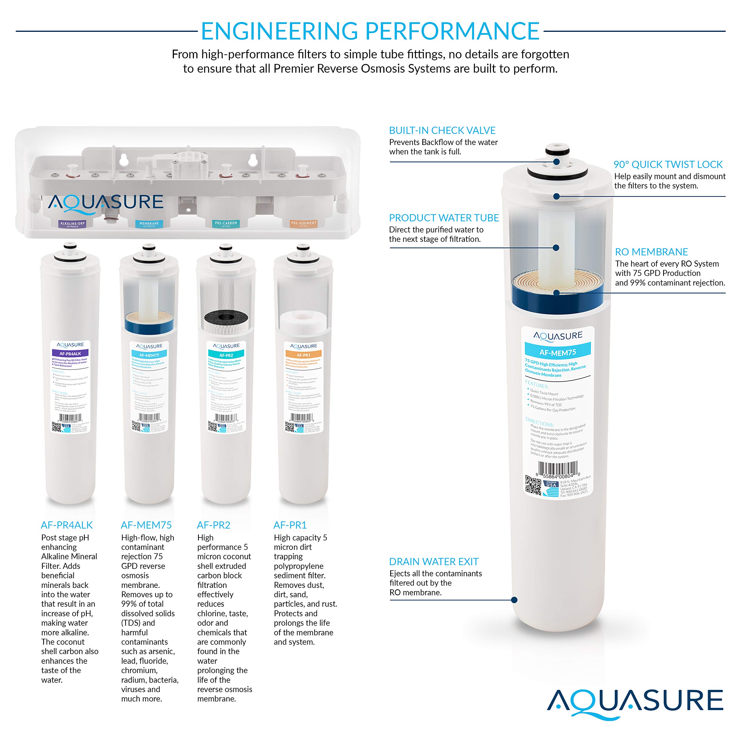 - 【 ADVANCED MULTI STAGE FILTRATION 】Enjoy the purest water possible with Aquasure's reverse osmosis system. Our 4-stage filtration process includes a sediment filter, activated carbon filter, RO membrane, and an alkaline filter. Each stage work in tandem to remove 99.99% of contaminants, impurities, and odors, resulting in the highest level of water purity.